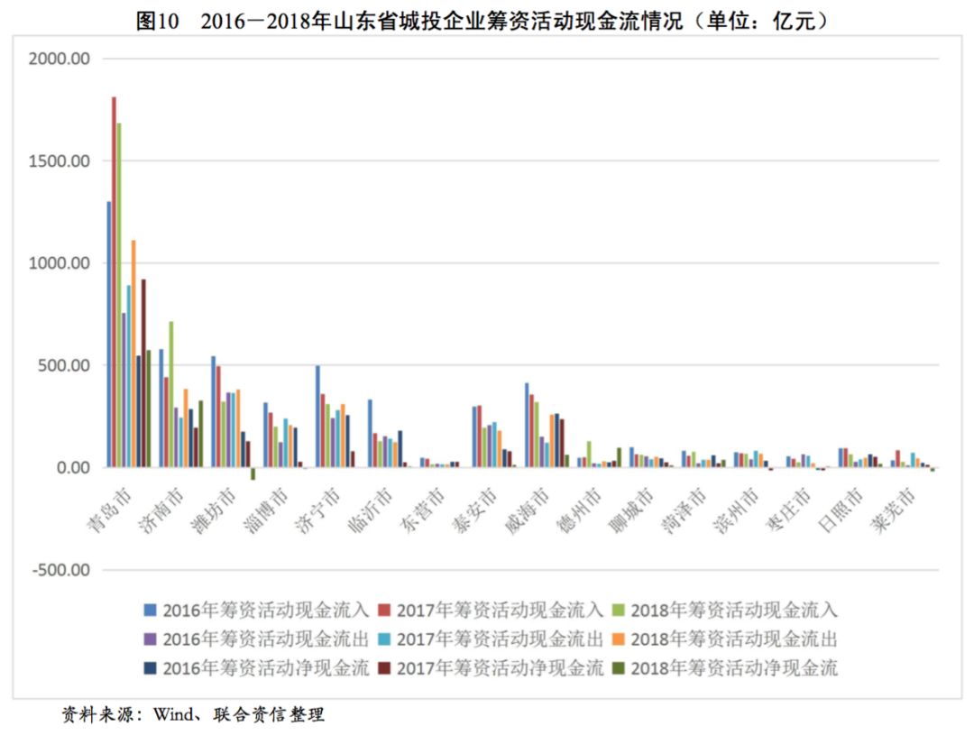 從各地級市城投企業籌資活動現金流狀況看,2016-2018年,青島市、濟南市和德州市城投企業籌資活動現金流入波動上升,年均復合增長率分別為13.80%、11.08%和65.37%,其余地級市城投企業籌資活動現金流入均呈波動下降趨勢,山東省大部分地級市城投企業籌資力度有所下降。反觀籌資活動現金流出情況,近三年除臨沂市、東營市、泰安市和棗莊市城投企業籌資活動現金流出有不同程度下降外,其余地級市城投企業籌資活動現金流出均有所增長。受流入減少、流出增多趨勢的共同影響,山東省大部分地級市城投企業籌資活動凈現金流均大幅下降,但經濟實力較強的青島市和濟南市仍保有較大規模的籌資活動現金凈流入。從籌資活動前凈現金流看,2018年除淄博市和萊蕪市為凈流入以外,山東省其余各地級市均為凈流出態勢,其中青島市、濟南市和泰安市資金缺口最大。從籌資活動后凈現金流來看,2016-2018年,山東省地級市城投企業籌資活動后凈現金流整體呈下降趨勢,其中青島市、濟南市、濰坊市、泰安市和臨沂市在2018年降幅明顯,上述地級市的城投企業融資壓力明顯加大。