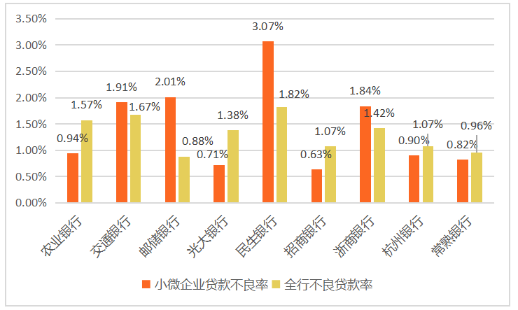 圖1:2020年部分銀行小微企業貸款不良率與全行