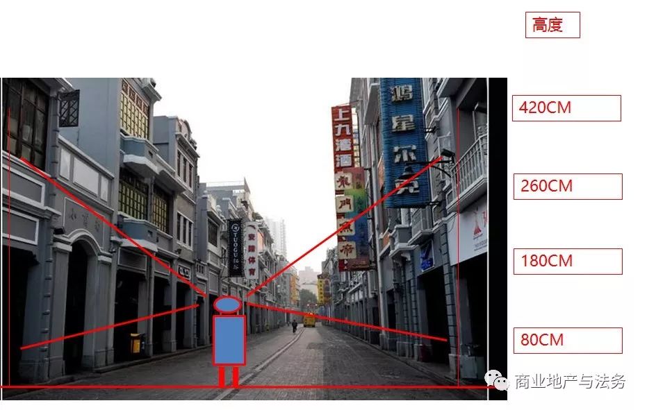 按照我這些年對于商業(yè)街的經(jīng)驗(yàn)總結(jié),商業(yè)街的尺度首先應(yīng)該以行人的活動為基準(zhǔn),而不是以高速過往機(jī)動車為參照。購物行人所關(guān)注的縱向范圍主要集中在建筑一層。對一層以上的范圍幾乎是“視而不見”。而橫向關(guān)注范圍一般也就在10米以內(nèi)最為合適,而超過15米寬的商業(yè)街,行人很可能只關(guān)注街道一側(cè)的店鋪,不會在超15米寬的范圍內(nèi)“之”字前行。這恰好說明了商業(yè)街建筑外觀設(shè)計(jì)的重點(diǎn)應(yīng)該在建筑外觀設(shè)計(jì)的第三個層面上。