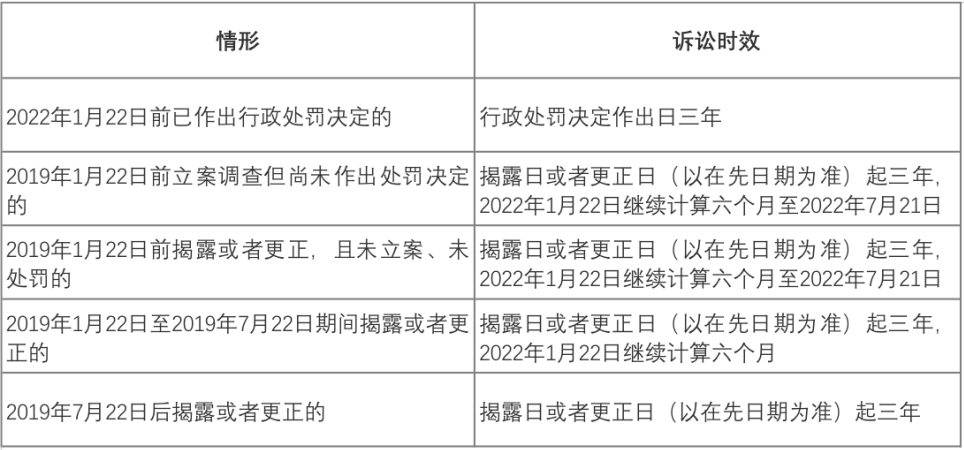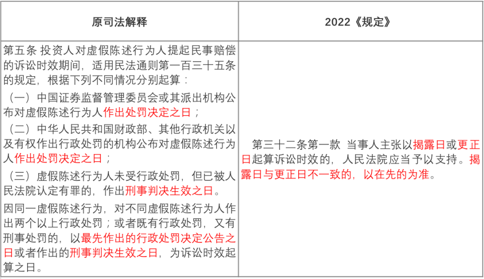 原司法解釋規(guī)定了行政或刑事前置程序,將行政處罰決定作出日或者刑事判決生效日作為訴訟時效的起算點。在廢除前置程序后,2022《規(guī)定》以揭露日或更正日二者在先日作為訴訟時效起算點,訴訟時效起算日大幅提前。