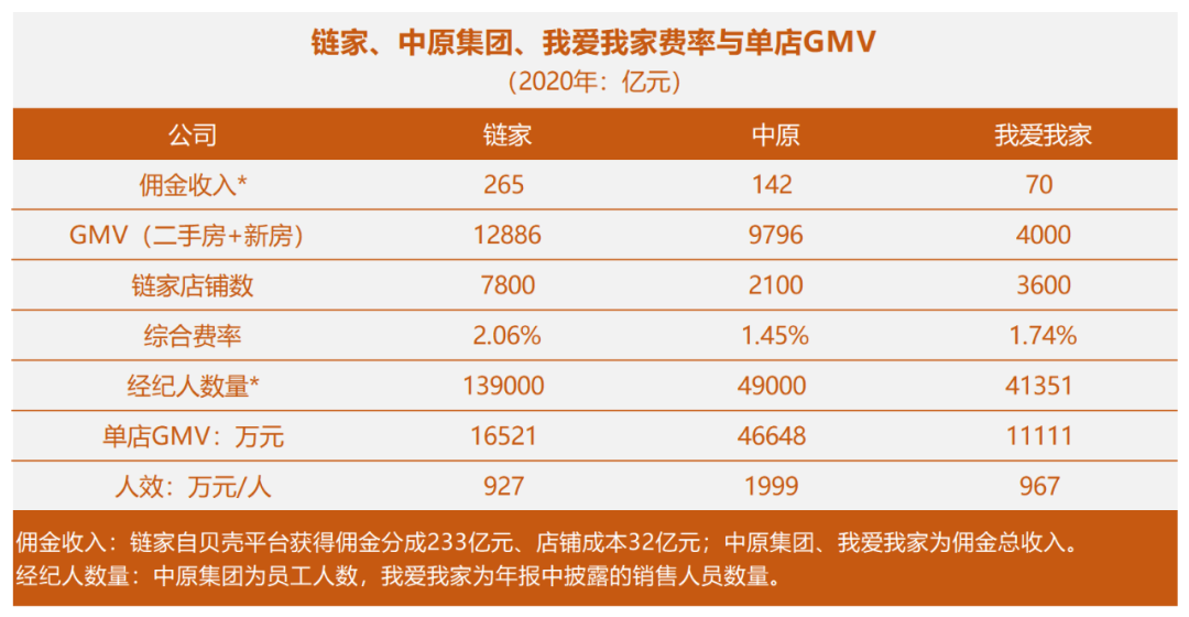 中原集團單店的GMV更高,但綜合費率更低,推測應該有較多的新房代理業務,量大價低。