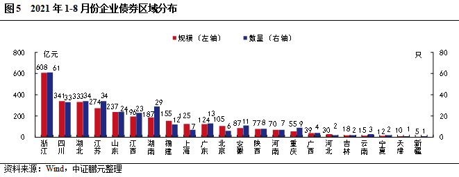 綜合2021年1-8月份看,浙江省發行規模最大,累計607.90億元,發行數量61只;四川省和湖北省分別發行340.80億元和333.10億元,位列第二、第三;江蘇省和山東省分別發行273.80億元、237.10億元,規模也相對較大。與上年同期相比,有13個省份的企業債發行規模同比增加,其中,浙江省同比增加291.9%,漲幅最大,其次是江西省和四川省分別增長104.10%和96.40%;共有7個省份的企業債發行規模同比下降,其中,云南省和天津省均同比下降77.8%,降幅較大。此外,貴州、山西、甘肅和海南省本年未發行。