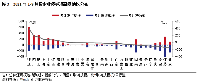 從地區分布看,2021年1-8月份企業債凈融資依然呈現兩極分化,多個經濟欠發達地區本年度尚未發行企業債。其中,浙江省實現凈融資392.52億元,遠高于其他省份,其次是四川省和湖北省分別實現凈融資181.62億元和153.20億元,位居第二、第三。此外,上海因償還規模較小,實現凈融資規模88.15億元,位居第四。而湖南省、江蘇省和廣東省因償還規模較大,凈融資規模為負。青海、甘肅、黑龍江、海南、內蒙古、山西、貴州、遼寧未發行企業債,其中,貴州和遼寧的償還規模較大,分別為92.48億元、101.94億元。