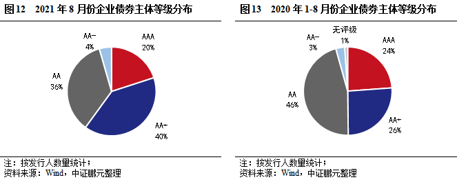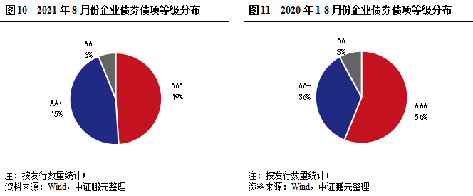 從發行主體等級看,8月AAA級主體9家,占比20%;AA+級主體18家,占比40%;AA級主體16家,占比36%,AA-級主體2家,占比4%。整體看,8月高等級企業債發行人數量占比60%,較上月下降6個百分點。綜合2021年1-8月看,AAA級主體占比24%,AA+級占比26%,AA+及以上占比較上年同期基本持平。