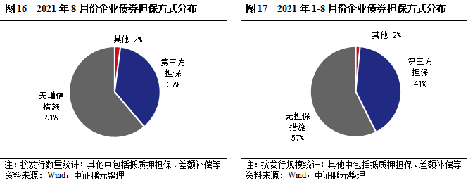 2021年8月,企業債有擔保的債券共計19只,數量占比39%,較上月下降1個百分點。分主體級別看,AA級主體選擇保證方式增信發行的債券比重為81.3%,較上月下降5.4個百分點;AA+級主體選擇增信發行的債券比重為15.8%,較上月下降15.5個百分點。綜合2021年1-8月看,有增信的債券占比43%,與上年持平。從趨勢看,2021年6月以來有增信債券占比呈現下降。