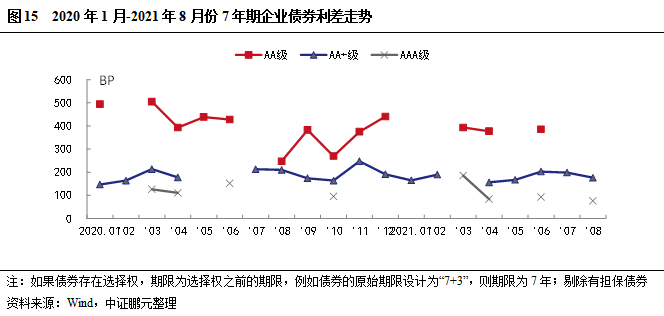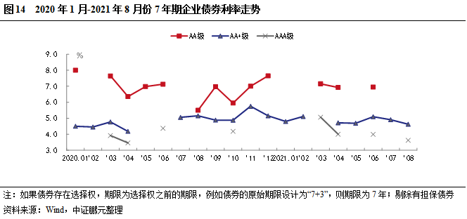 從趨勢看,7年期除權無擔保企業債,8月份AA+級平均發行利率下行,利差收窄,其他級別上月未發行。AAA級平均發行利率和利差較6月有所下行。