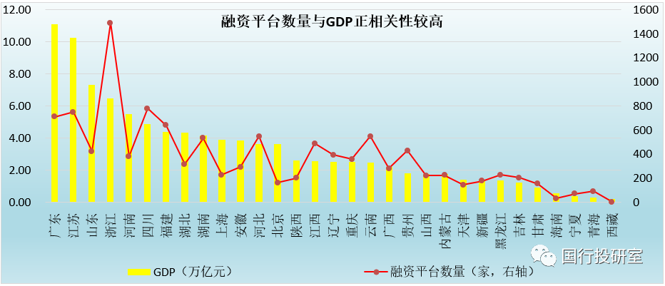2、數(shù)據(jù)上顯示,融資平臺(tái)數(shù)量分布與地區(qū)GDP之間有較高的相關(guān)性,如融資平臺(tái)主要分布在浙江、四川、江蘇、廣東、福建、河北、云南、湖南、江西、貴州、山東、遼寧等12個(gè)地區(qū)的融資平臺(tái)數(shù)量占比達(dá)到70%左右。這主要是因?yàn)榉€(wěn)增長(zhǎng)的背景下,承擔(dān)著各地基建主要任務(wù)的融資平臺(tái)具有存在的必要性,特別是地方政府債券額度較為有限的低經(jīng)濟(jì)總量地區(qū)。