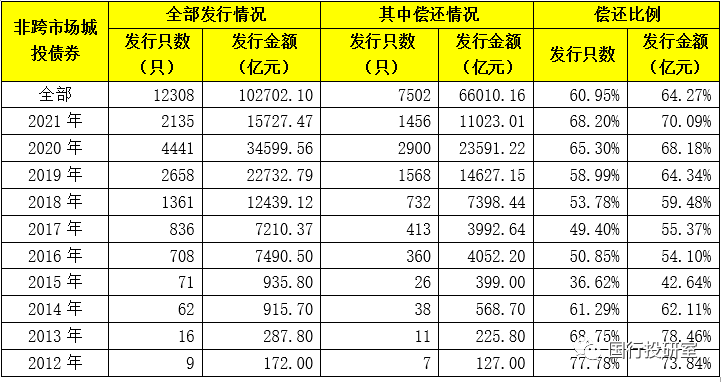 1、截至2021年4月19日,全部12308只未跨市場(chǎng)發(fā)行的城投債中,有7502只的資金用途為償還存量債務(wù)、占比達(dá)到60.95% 這10.27萬(wàn)億的未跨市場(chǎng)發(fā)行的城投債中,有6.60萬(wàn)億的資金用途為償還存量債務(wù)、占比達(dá)到64.27%。