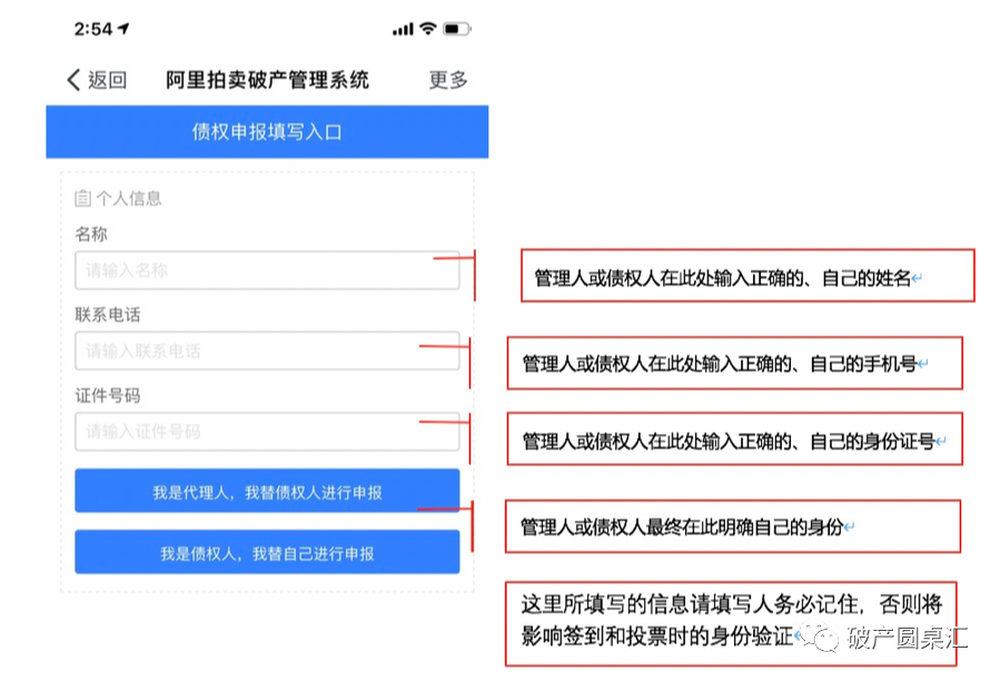 - 無論代理多少個債權人并填寫多少次被代理債權人的信息,代理人在此處所填寫、輸入的都應該是自己的身份信息,系統在收到這些信息后會自動將債權人信息與代理人“掛鉤”,方便代理人在債權會議中進行線上投票;