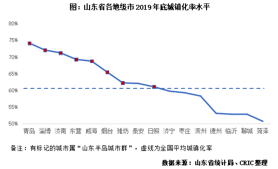 屬“山東半島城市群”的8座城市城鎮化率普遍較高,青島領跑。從城鎮化率來看,截至2019年,全省平均城鎮化率為61.5%,略高于全國60.6%的平均水平。省內城市出現分化,屬“山東半島城市群”(包括濟南、青島、淄博、威海、煙臺、濰坊、日照和東營在內)的8個城市,城鎮化水平均高于全國平均水平。其中,青島的城鎮化率最高,接近75%,與長三角寧波、無錫等城市處同一梯隊。偏內陸的魯西南幾個城市城鎮化率暫處50%-60%區間,推進城鎮化的同時能催生更多的住房需求。同時,山東省積極開展棚戶區改造,2021年確保新開工棚戶區改造12.3萬套,也將支持山東省房地產的良性發展。