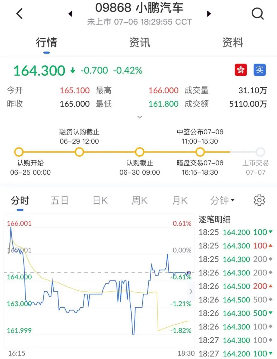 小鵬汽車將于7月7日在港交所掛牌上市,發行價為每股165港元,股票代碼9868。7月6日,小鵬汽車暗盤開漲后,跌破發行價,最低價達162港元,暗盤收盤價為164.3港元。
