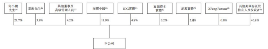 招股書顯示,小鵬汽車聯合創始人、董事長兼首席執行官何小鵬及其關聯公司持股21.75%,為控股股東;淘寶中國持股11.9%,為最大機構股東,IDG資本持股4.8%,小鵬汽車聯合創始人、總裁夏珩及其關聯公司持股3.8%,五源資本持股3.2%,紀源資本持股2.8%。