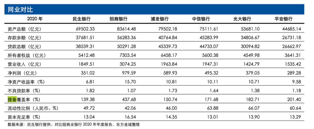 值得一提的是,民生銀行在去年末撥備覆蓋率低于150%,并處于同業較低水平。
