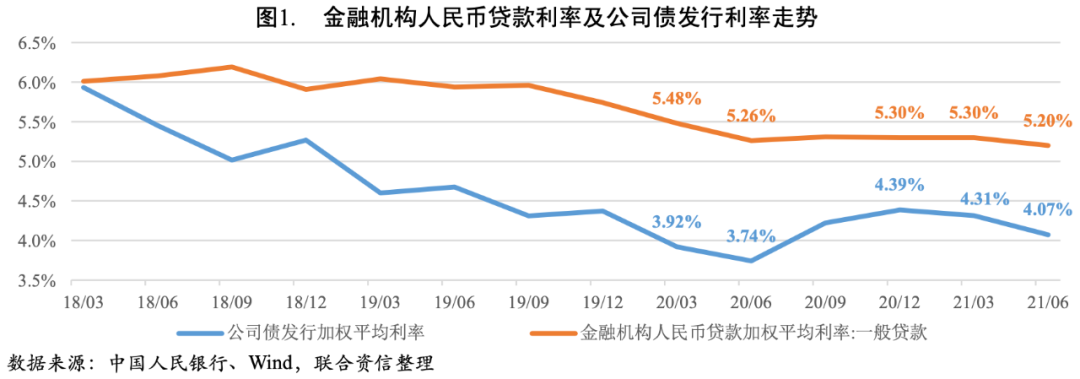 2021年上半年,貨幣政策基本回歸常態,信貸力度總體穩固,貸款利率穩中有降,公司債發行利率呈下行趨勢,但仍明顯高于上年同期。二季度公司債發行加權平均利率明顯下降,可能是由于一季度信用風險事件增多,導致市場風險偏好降低,高級別發行人占比提高,從而拉低了平均利率。