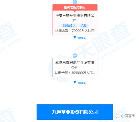 從股權結構看,九通投資是京御房地產100%控股子公司,是華夏幸福間接全資子公司,公司實際控制人為王文學。