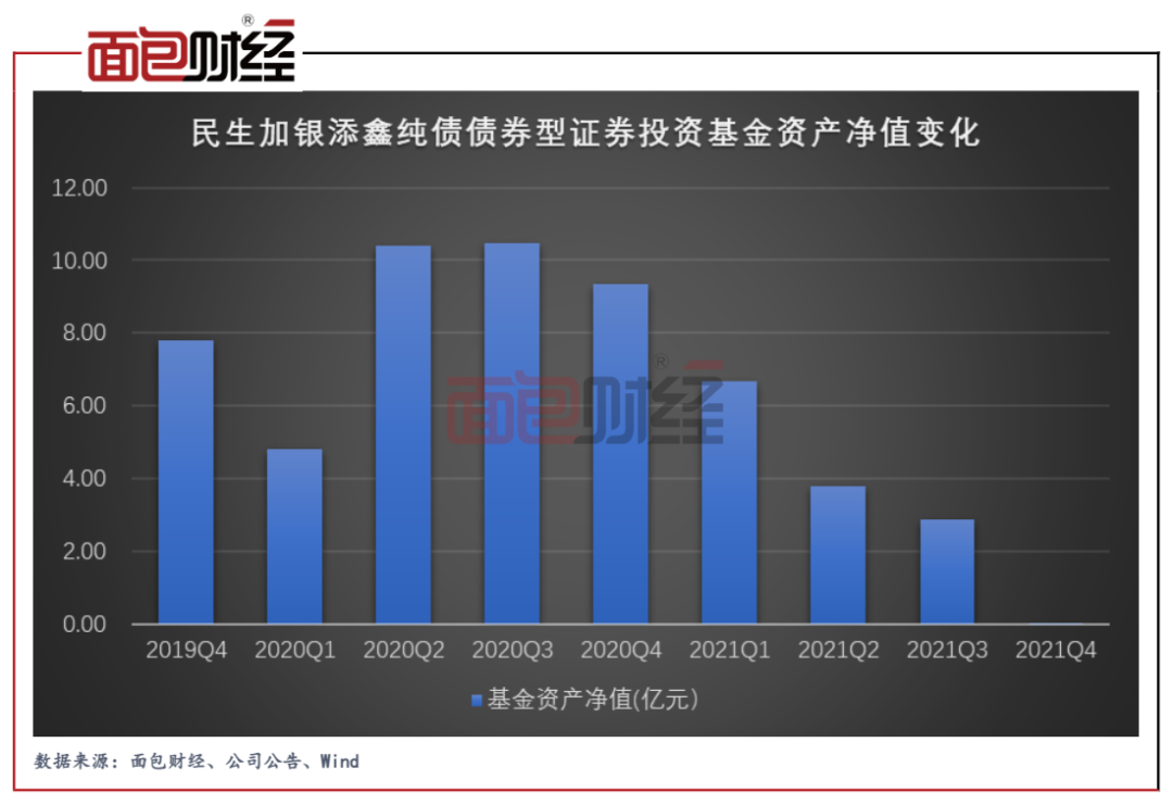 民生加銀添鑫純債債券型證券投資基金成立于2019年8月,初始基金經理為陸欣。2021年7月,胡振倉新任基金經理,隨后陸欣于當年8月離職。2019年末,民生加銀添鑫純債債券型證券投資基金的資產凈值約為7.81億元。到了2020年三季度末,該基金的資產凈值達到最高,約為10.49億元。但在此之后,基金資產凈值逐季下降,2021年四季度末時已只有約600萬元。