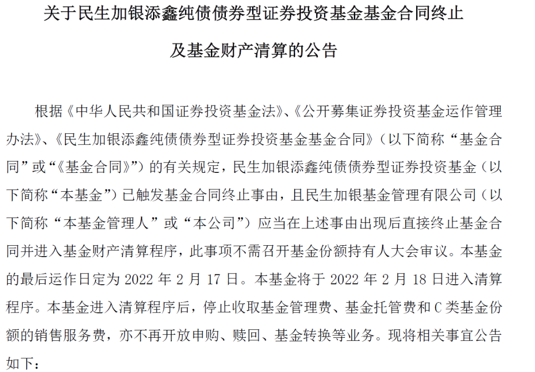民生加銀基金近日發布公告稱,民生加銀添鑫純債債券型證券投資基金(包含民生加銀添鑫純債債券A、民生加銀添鑫純債債券C)已觸發基金合同終止事由,將于2022年2月18日進入清算程序。