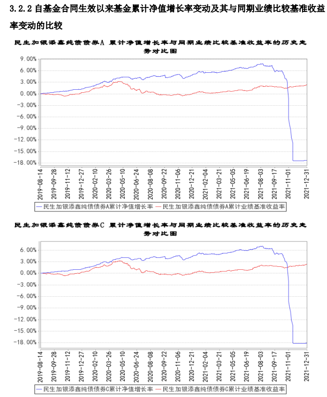 數據顯示,2021年下半年,民生加銀添鑫純債債券A、民生加銀添鑫純債債券C的凈值陡然下降,最終分別錄得當年虧損21.43%和21.73%,也遠遠跑輸同期的業績基準收益率。從單月業績來看,基金凈值大幅下跌主要發生在2021年11月。