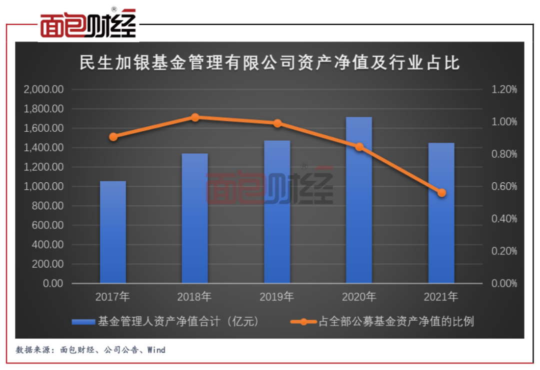 查閱近五年的資產凈值發現,民生加銀基金2017年至2020年的資產凈值整體處于上升趨勢,但2021年出現明顯下降。對比來看,公募基金行業的整體規模則從2020年約20萬億元大幅上升至2021年突破25萬億元。一漲一跌共同作用下,民生加銀基金的行業資產凈值占比在2021年出現大比例下滑。