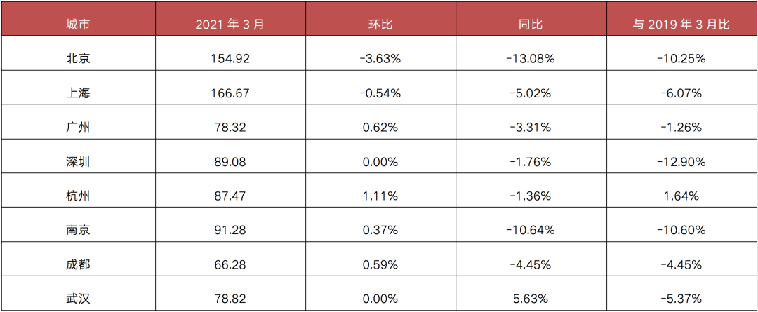 2021年3月八城品牌集中式公寓租金除個別城市外同比及較2019年同期整體均有所下滑,說明19年前后品牌企業對行業偏樂觀,隨著疫情和政府對市場的不斷監管,租金價格回歸理性。
