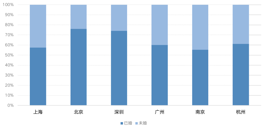 目前,我國一、二線大城市的新一代城市租客群體主要為26-35歲的85、90新婚夫妻。具體來看,在城市租住人群中,26-35歲的租客群體在核心大城市中占比超50%,為租賃市場的絕對客群主體。租客婚姻狀況方面,大城市中已婚的租賃人群多于未婚人士。