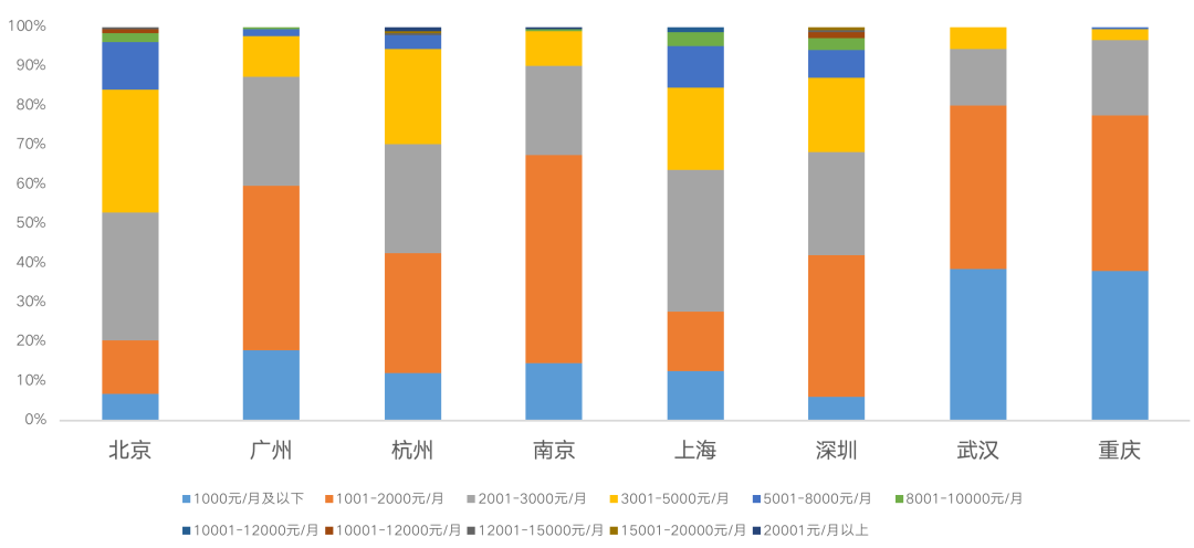 整體來看,北京和上海租賃市場中2000-3000元/月占比較高,其他六城2000元/月占比較高,中低端租賃需求仍是市場主力。