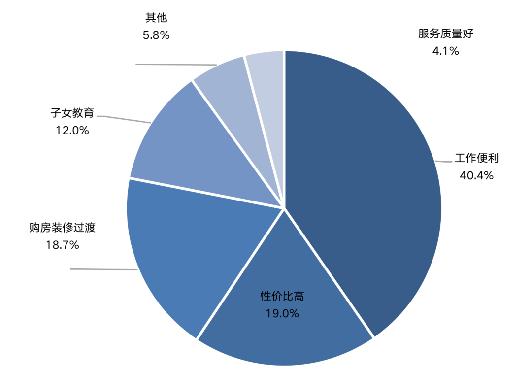 其中,本地有房租房的客群多因工作便利、性價比高、裝修過渡等因素租房。在本地有房租房原因中,工作便利占比最高,約達40.4%,其次是性價比高、購房裝修過渡以及子女教育,三者各自所占比重均超過10%。伴隨著一、二線城市的房價高企,租房也成為一種性價比較高的居住方式。
