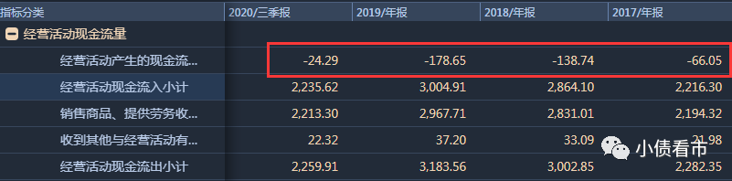 自2017年以來,蘇寧易購經(jīng)營性現(xiàn)金流凈額已由凈流入轉(zhuǎn)為凈流出狀態(tài),2017年至今年前三季度該指標(biāo)分別為-66.05億、-138.74億、-178.65億以及-24.29億元,對債務(wù)和利息的保障能力較差。