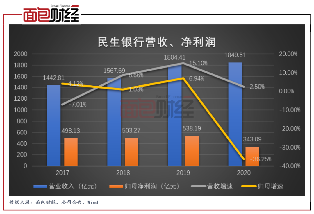 從業(yè)績(jī)來(lái)看,2020年民生銀行實(shí)現(xiàn)營(yíng)業(yè)收入1849.51億元,同比上升2.5%;由于2020年該行計(jì)提大量信用減值損失,導(dǎo)致其歸母凈利潤(rùn)銳減195.1億元。