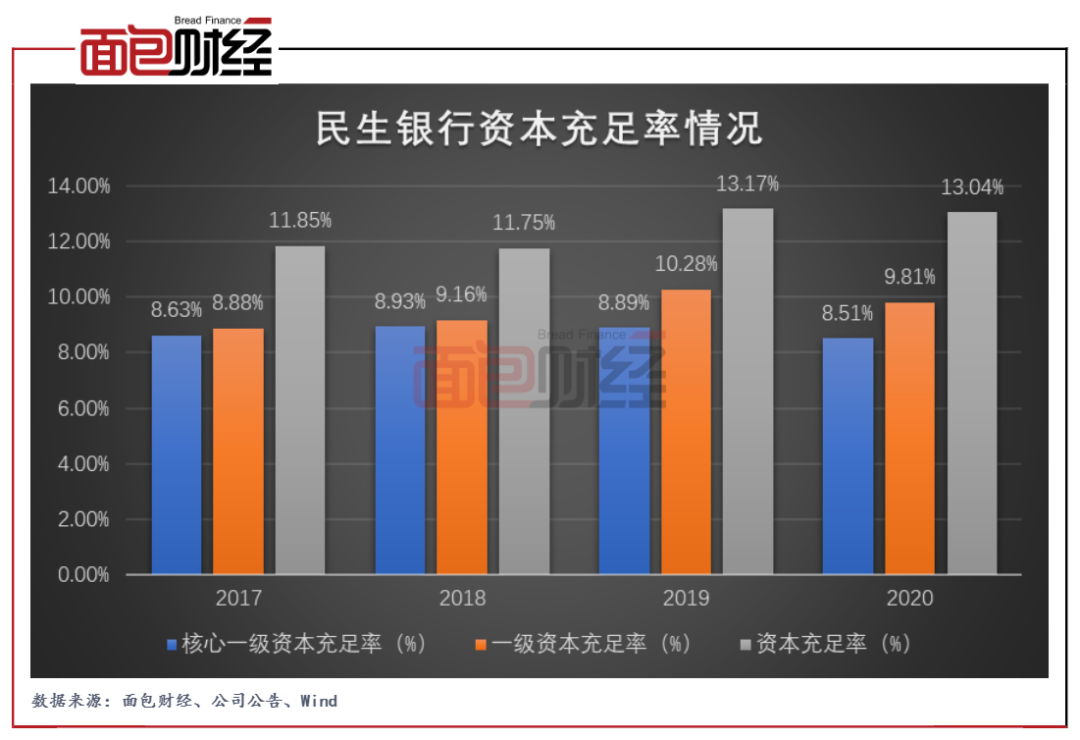 數(shù)據(jù)顯示,截至2020年末,民生銀行的資本充足率為13.04%,較上年末下降0.13個(gè)百分點(diǎn);核心一級(jí)資本充足率、一級(jí)資本充足率分別為8.51%、9.81%,較上年末下降0.38、0.47個(gè)百分點(diǎn)。