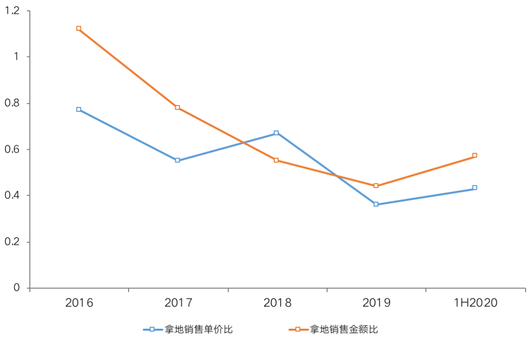 以南京悅峯項目為例,該項目由新城控股于2016年9月摘得,成交樓面價20069元/㎡,是當年青龍地鐵小鎮的地王項目,今年上半年該項目的結算均價為25839元/平方米,地價房價比達0.78,毛利水平較低,由于上半年結算金額較大,達35億元,對整體盈利能力影響較大。