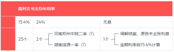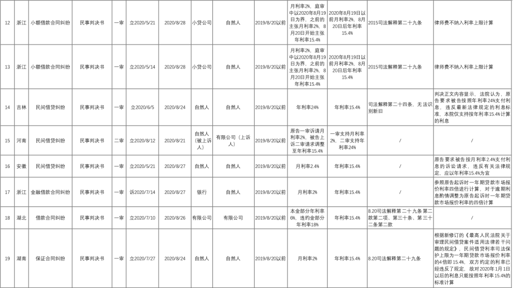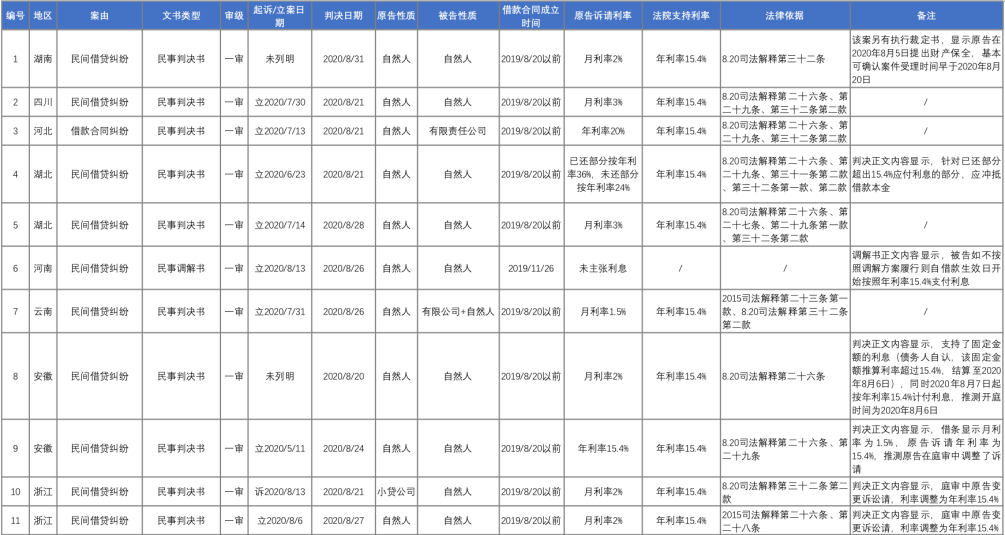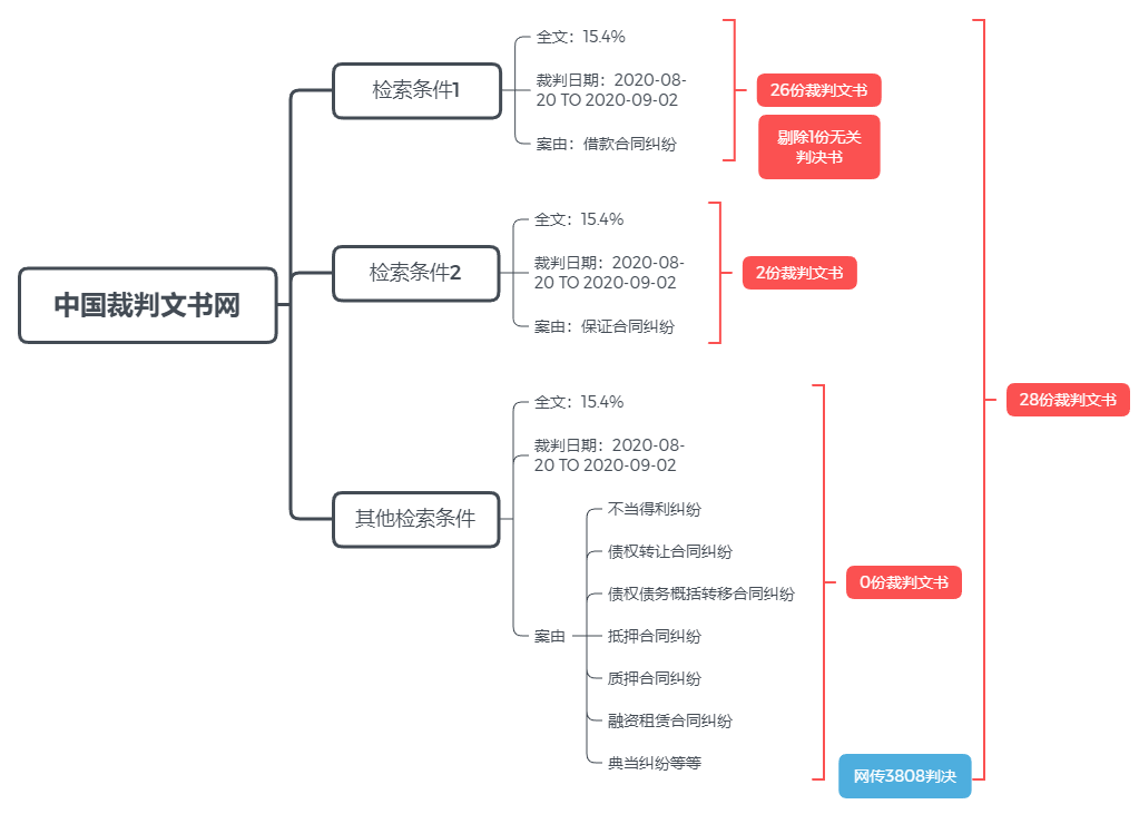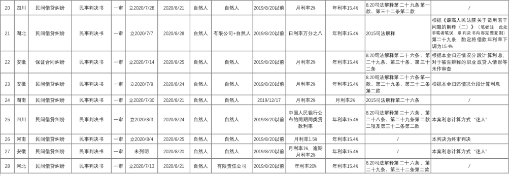 好奇心驅使下,我們通過“中國裁判文書網”,以“全文:15.4%”“裁判日期:2020-08-20 TO 2020-09-02”以及相關案由名稱為檢索條件,進行了“地毯式”案例檢索,獲得了28份裁判文書。在剔除一份與“四倍LPR”不相關判決書,以及加入3808判決后,我們形成了28份裁判文書作為研究樣本。