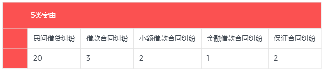 2. 包括5類案由:民間借貸糾紛(占絕對多數)、借款合同糾紛、小額借款合同糾紛、金融借款合同糾紛、保證合同糾紛。