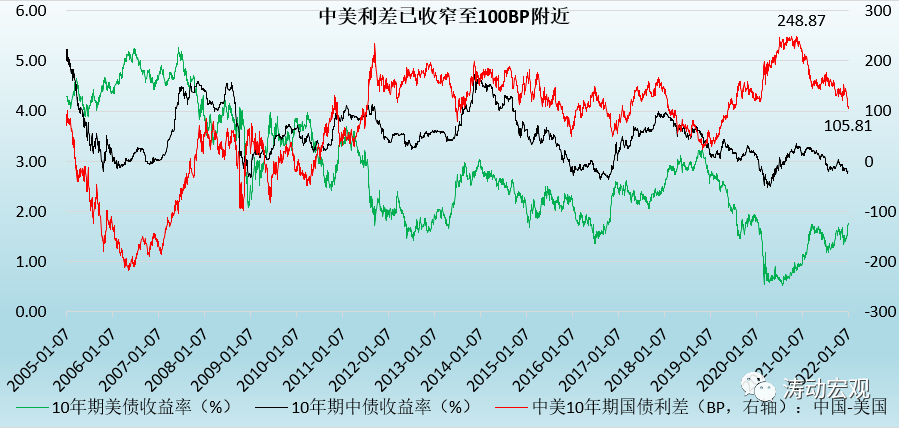 美債收益率的上行直接影響中美利差的變化。截至2022年1月 7日,中國和美國10年期國債收益率分別為2.82%和1.76%,中美利差相應收窄至106BP,創下2019年5月以來新低,較2020年11月的250BP附近收窄140BP左右。