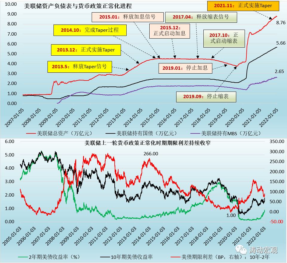 2021年12月以來的美債收益率快速上行、2022年1月5日公布的12月美聯儲會議紀要等諸多證據均表明,美聯儲將于2022年3月完成Taper、2022年3-4月啟動加息(預計全年加息3-4次),同時在加息啟動之際將很快啟動縮表,以改變上一輪貨幣政策正常化周期所帶來的利率曲線平坦化困境,這意味著本輪美聯儲加息與縮表的節奏要明顯快于上一輪貨幣政策正常化時期。