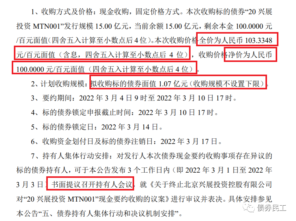 根據北京興展投資控股有限公司(以下簡稱“興展投資”)于2022年3月17日發布的《北京興展投資控股有限公司關于對“20興展投資MTN001”現金要約收購的公告》,本次現金要約收購已完成,持有人沒有申報標的債券,最終收購面額為0。在此之前的2022年2月28日,興展投資發布公告,對“20興展投資MTN001”開展現金要約收購,收購價格全價為人民幣103.3348元/百元面值,收購價格凈價為100元/百元面值。