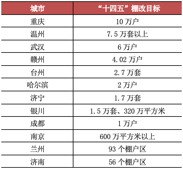 從公布“十四五”棚改目標的12個城市來看,成都、銀川、濟寧等棚改規模均顯著縮量,棚改計劃開工量皆不足2萬套,成都更是低至1萬戶。僅限于重慶、溫州個別城市仍有一定的棚改規模,但較“十三五”歷史高峰期相差甚遠。典型如重慶,“十四五”期間將實施10萬戶棚戶區改造,“十三五”期間則累計完成棚戶區改造24.78萬戶,降幅多達60%。