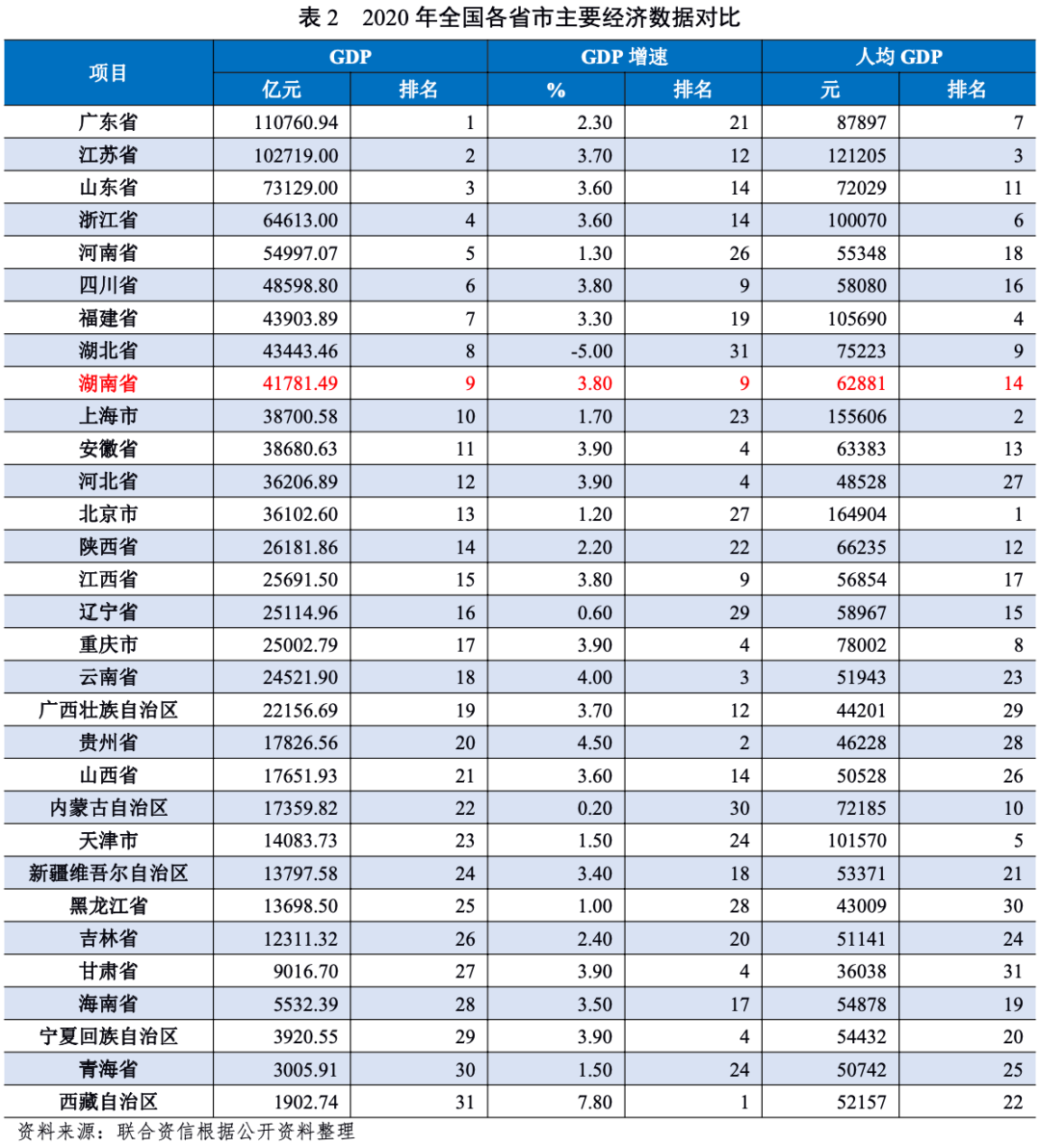 湖南省長株潭地區、湘南地區、湘北地區和湘西地區經濟實力分化程度較高,長株潭地區經濟實力明顯高于其他地區,湘西地區經濟實力較弱;長沙市作為湖南省省會城市,經濟實力及增速均處于全省領先地位,為全省唯一GDP規模超萬億的地級市。