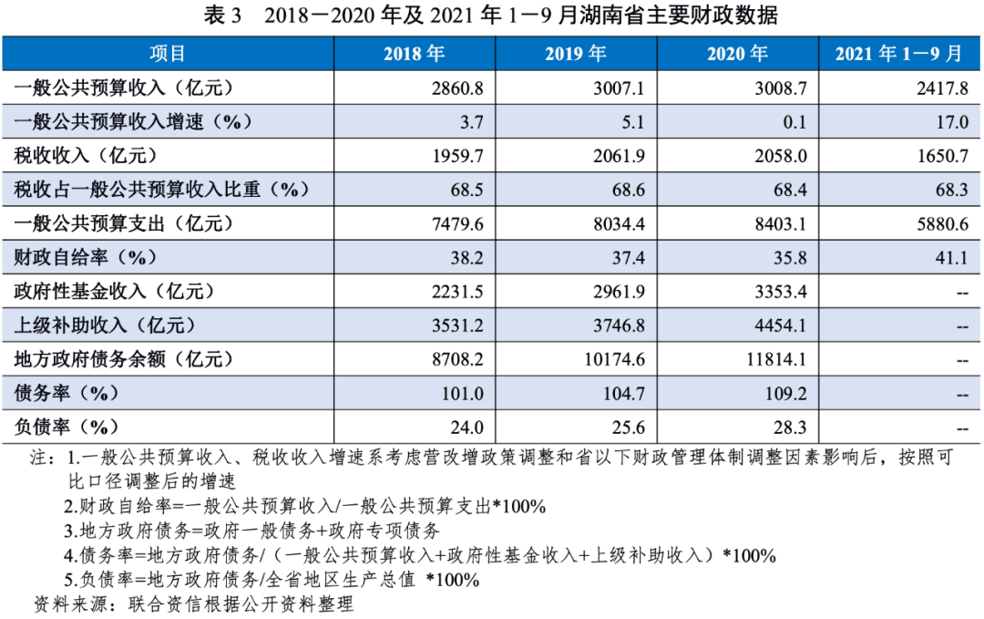近年來,湖南省地方一般公共預算收入持續增長。2018-2020年湖南省地方一般公共預算收入分別為2860.8億元、3007.1億元和3008.7億元,增速分別為3.7%、5.1%和0.1%,2020年增速有所放緩。全省一般公共預算收入中稅收收入占比分別為68.5%和68.6%和68.4%,一般公共預算收入質量尚可;全省一般公共預算支出分別為7479.6億元、8034.4億元和8403.1億元,財政自給率(一般公共預算收入/一般公共預算支出)分別38.2%、37.4%和35.8%,財政自給能力偏弱。基金收入方面,湖南省政府性基金收入持續增長,2018-2020年分別為2231.5億元、2961.9億元和3353.4億元;同期,全省上級補助收入持續增長,分別為3531.2億元、3746.8億元和4454.1億元。2021年1-9月,湖南省一般公共預算收入完成2417.8億元,同比增長17.0%,其中稅收收入1650.7億元,同比增長17.0%,非稅收入767.1億元,同比增長17.1%,隨著“新冠”疫情的影響逐漸減弱,經濟逐步修復,湖南省一般公共預算收入較上年同期大幅增長。