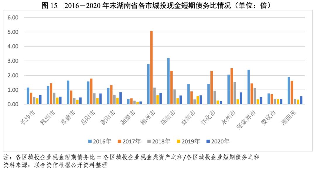 從湖南省各地級市發債城投企業貨幣資金對短期債務的覆蓋情況來看,2016-2020年末,除長沙市外,各地級市發債城投企業貨幣資金對短期債務的覆蓋程度均呈不同程度的下降,反映出湖南省各地級市發債城投企業整體流動性壓力較大。截至2020年底,湖南省各地級市(除懷化市外)現金短期債務比均較上年底小幅上升,流動性壓力有所緩和,但仍相對較大。具體看,截至2020年底,湘潭市城投企業貨幣資金/短期債務倍數不足0.20倍,為省內各地級市中最低,湘潭市發債城投企業短期流動性壓力在省內各地級市中排名仍靠前。