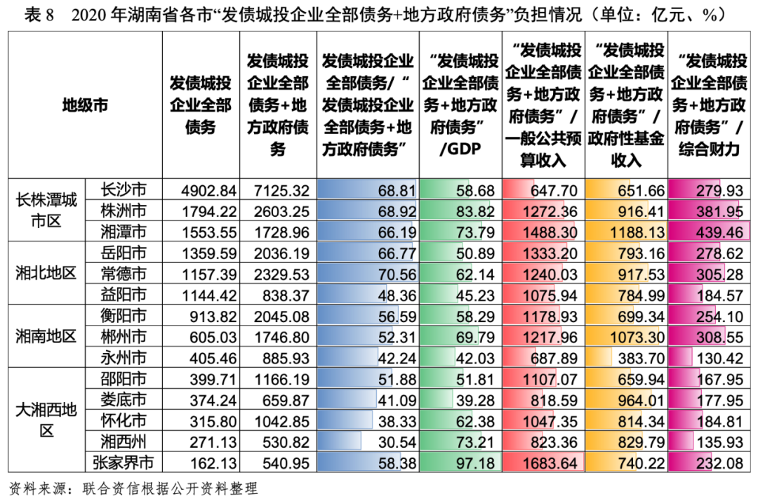 從各地區債務負擔來看,“發債城投企業全部債務+地方政府債務”/GDP較高的地級市分別為張家界市、株洲市、湘潭市和湘西州,截至2020年底,上述地區該比值均超過70%,債務負擔較重;婁底市、永州市和益陽市該比值不到50%,債務負擔相對較輕。