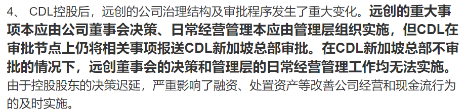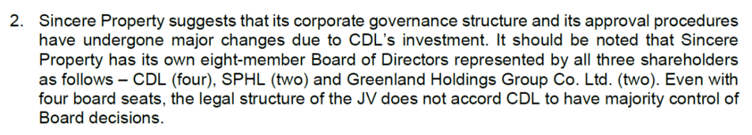 但是CDL對(duì)此并不買賬,針對(duì)協(xié)信遠(yuǎn)創(chuàng)的聲明進(jìn)行反駁,表示其對(duì)CDL的指責(zé)均為不實(shí),大致意思為協(xié)信遠(yuǎn)創(chuàng)董事會(huì)共有8人,協(xié)信和綠地各有2個(gè)名額,CDL所占據(jù)的4個(gè)董事會(huì)席位,不會(huì)對(duì)協(xié)信遠(yuǎn)創(chuàng)構(gòu)成控制。