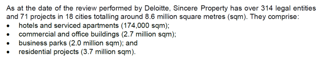殊不知,協(xié)信遠(yuǎn)創(chuàng)的資產(chǎn)結(jié)構(gòu)非常重,根據(jù)事后CDL委派德勤會(huì)計(jì)師事務(wù)所對(duì)協(xié)信遠(yuǎn)創(chuàng)的全面審計(jì),協(xié)信在全國18個(gè)城市的71個(gè)項(xiàng)目,總計(jì)還有860萬平米的可售或自持面積,其中住宅只有360萬平米,不到45%,其余為酒店或服務(wù)式公寓、商場、寫字樓以及科技園區(qū)等。