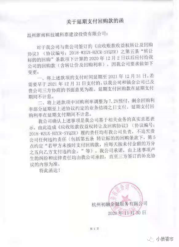 《小債看市》獲得的《關(guān)于延期支付回購款的函》顯示,2020年12月2日以后科泰建投應(yīng)付給杭州初融的回購款,延期至2021年12月31日支付。