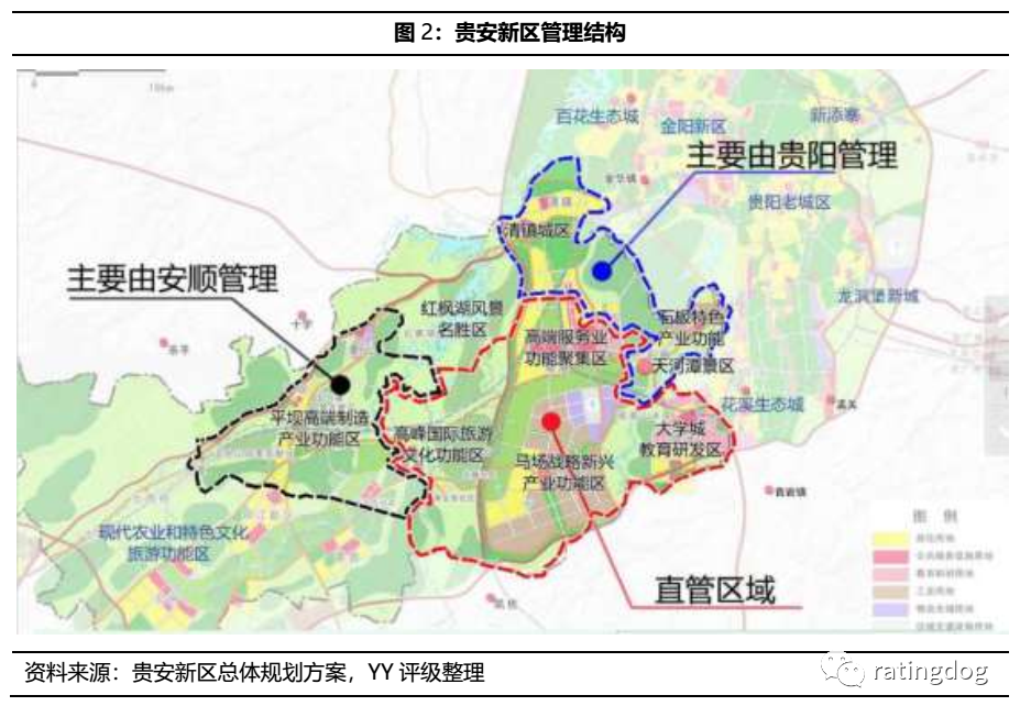 貴安新區分為直管區和非直管區,其中直管區域470平方公里,所轄范圍為貴陽市花溪區湖潮鄉、黨武鄉,清鎮市紅楓湖鎮平寨村、蘆貓塘村、中一村、中八村、蘭安村、池菇村、中八居委會,安順市平壩縣馬場鎮、高峰鎮。貴安新區直管區由省委、省政府的派出機構貴安新區黨工委管委會統管,履行開發建設和經濟社會管理職能,而非直管區由屬地各級政府負責管理,享受貴安新區作為經濟功能區的各項政策支持。