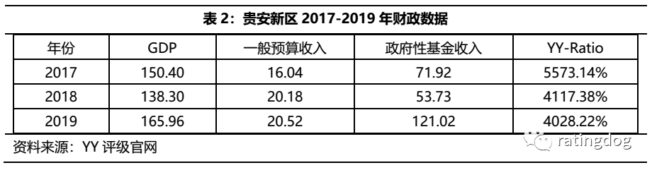 貴安新區經濟水平較差,財政實力弱,債務負擔非常重。2017-2019年,貴安新區的地區生產總值和一般預算收入增長緩慢,年復合增長率為5.05%,一般預算年復合增長率為13.1%。原因在于貴安新區的大數據工程大部分尚在建設過程中,未投入運營,新區又對招商引資的企業進行了稅收減免,致使一般預算收入較低。而政府性基金收入在19年有較大幅度的增長,較上一年增長125.24%。貴安新區的YY-Ratio更是驚人之高,盡管近年來逐步下降,2019年還是處在4028.22%的高位,但結合貴安新區的城建和產業發展進程,也在情理之中。