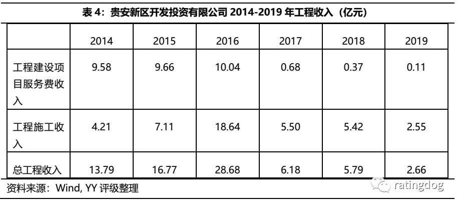 具體業務方面,安置房銷售是公司2017年新增的業務,為委托代建模式,由土儲中心將安置房項目委托給公司代建,待建成后按照“成本+稅費+利潤”的定價原則由土儲中心付款。作為新區最主要的基建開發主體,公司的工程施工業務可反映新區的基建進度安排。2016-2019年,公司工程施工業務板塊新簽合同總額分別為1.81億、26.57億、2.45億和2.07億。可以看出,公司打算新造的工程項目在2017年后大幅下降。公司的工程收入16年最高達到28.68億,之后大幅下降,也可同步印證得出,貴安新區的基建工程建造的腳步在大幅放緩。