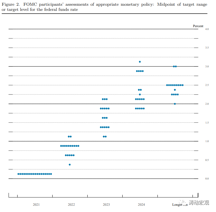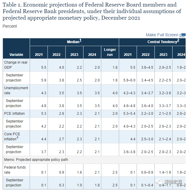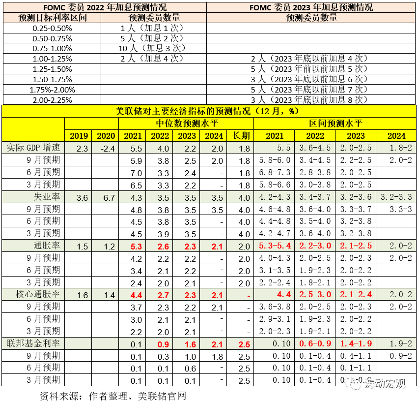 2、大幅上調了2022-2023年的聯邦基金利率預期,將2022年與2023年的聯邦基金利率預期區間分別由9月的0.1-0.4和0.4-1.1提升至0.6-0.9和1.4-1.9,即2022年與2023年聯邦基金利率分別上調60-75BP和100BP,也即2022與2023年將分別需要加息3次。