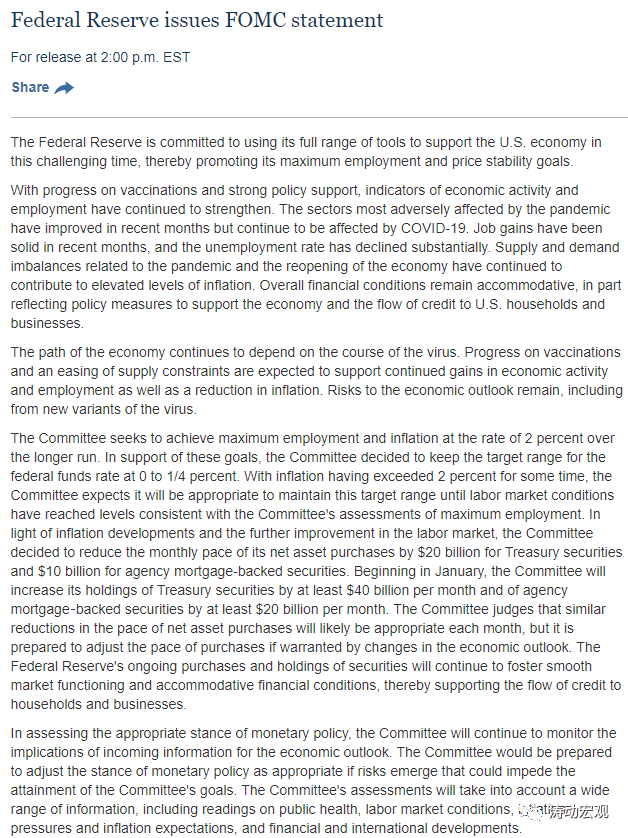 2021年12月14-15日,美聯儲召開了年內最后一次議息會議,并于12月16日凌晨兩點(北京時間)發布會議決議,現解讀如下: