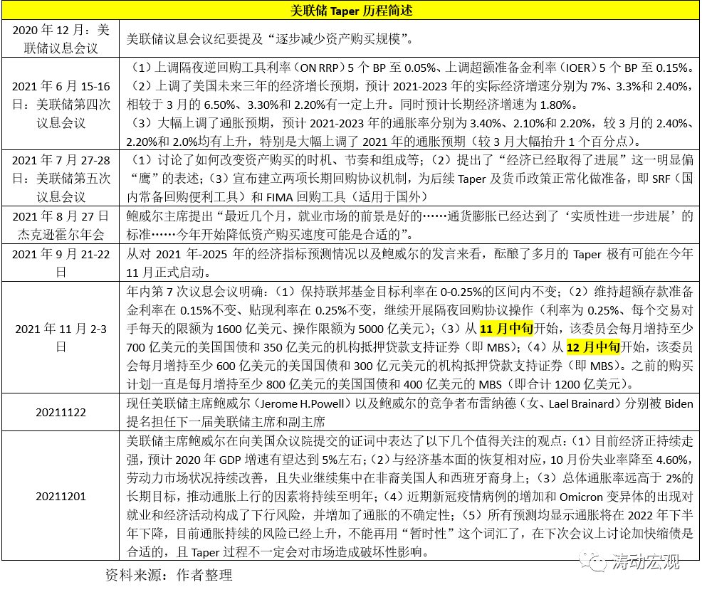 意味著2022年1月的縮減購債規模是11月和12月的兩倍,將完成Taper的時間由11月預期的2022年6月大幅提升至2022年3月。